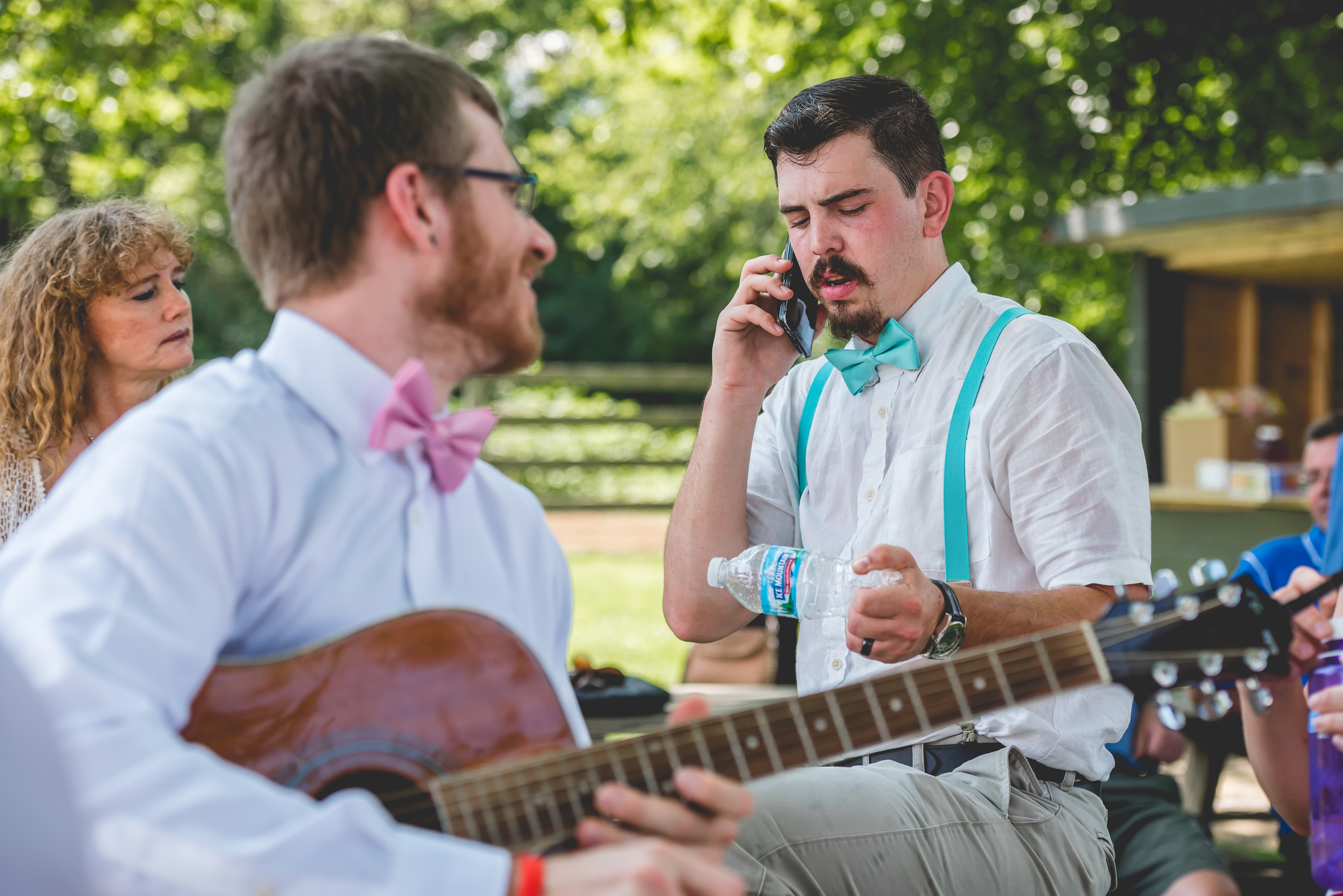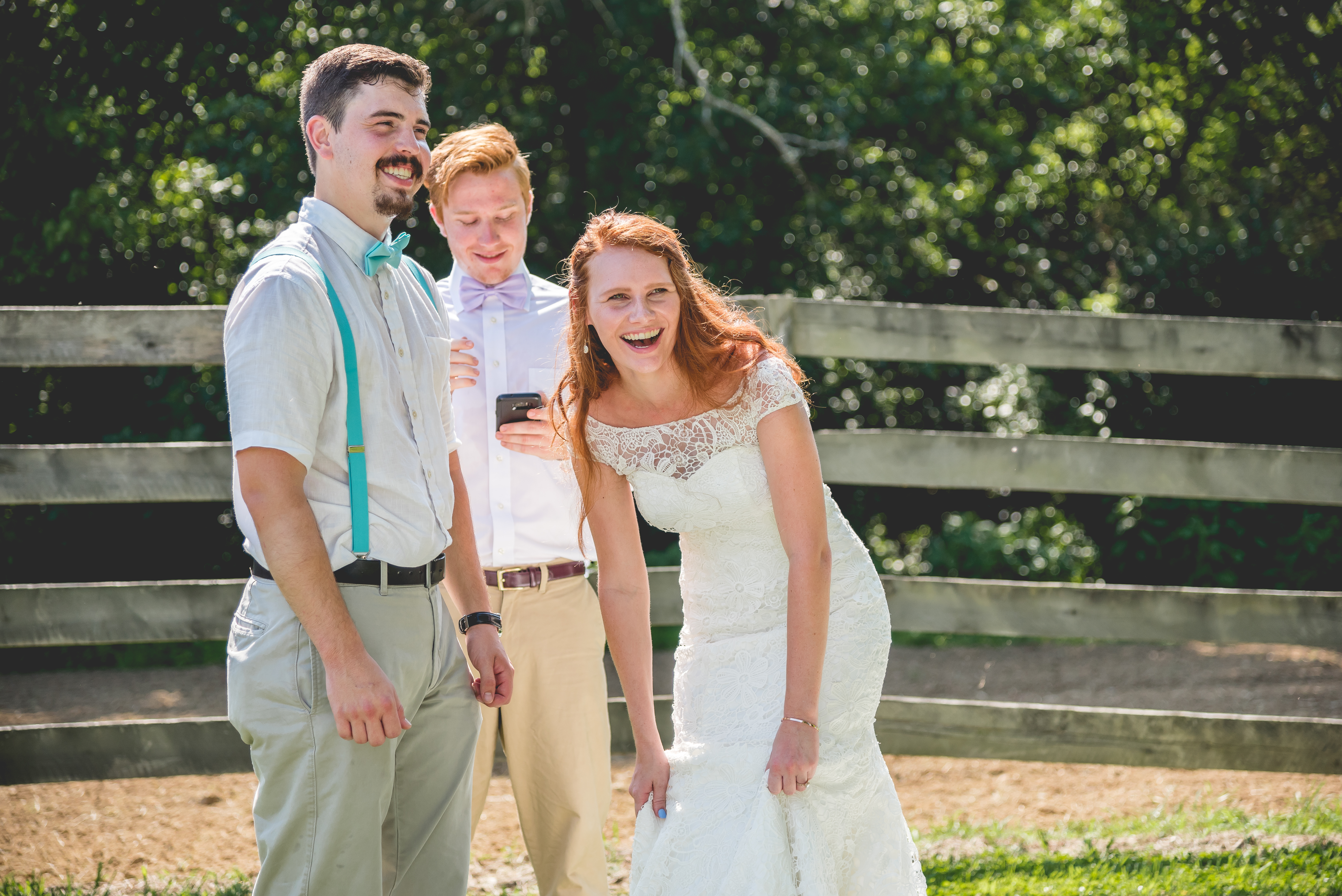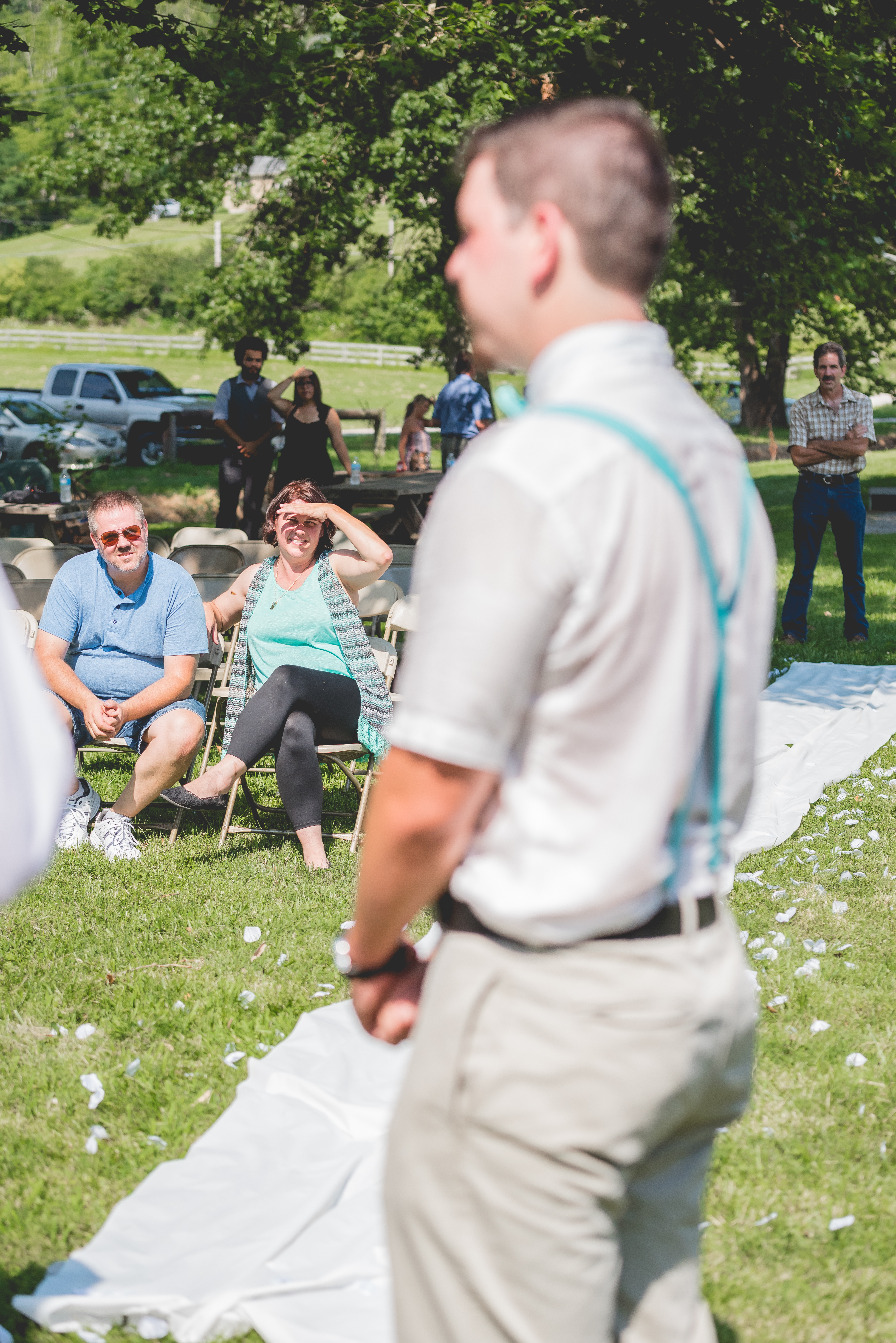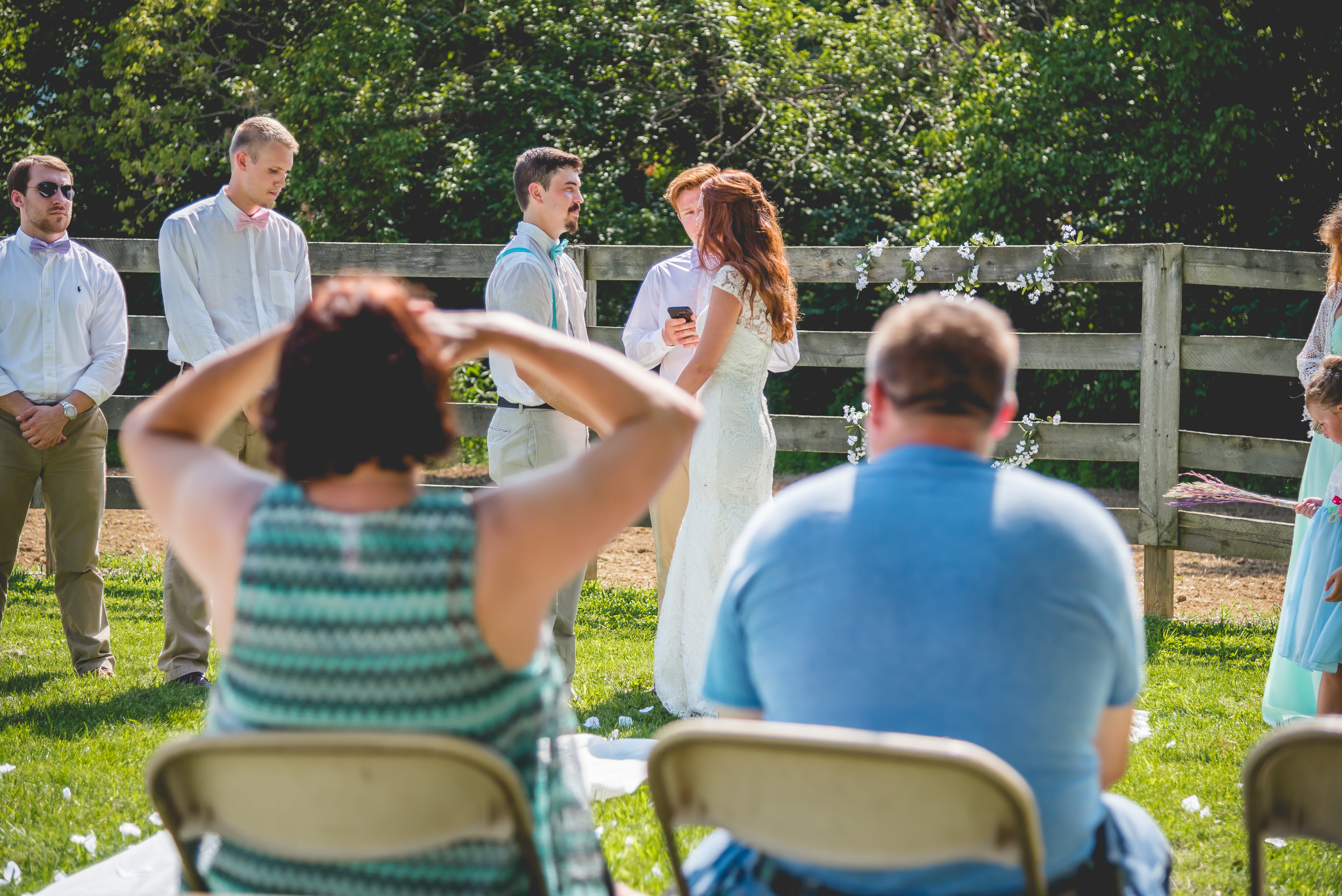 Close your eyes and imagine the scene. It was a sweltering hot august day in a small Kentucky berg called Camp Springs. The trees were lush and full and the sun and clouds were in perfect harmony in the sky, providing just the right light for an out door country wedding. The family was all there and believe me when I tell you there were plenty of folks at this shin-dig! The grooms dad is one of nine siblings and the bride’s family was all up from Florida to see the two families join together in wedded bliss! There were so many people there in that field having cold drinks, mingling and meeting new people and catching up with old friends that they hadn’t seen in a while. Did I mention it was HOT, HOT, HOT?!?! The temperature actually plays into the plot at this point… follow me on this. Someone had to go up the road and buy another big bag of ice. Not realizing how late in the day it had gotten, the GROOMS MOTHER was either elected to go or was just acting in accordance with her good nature and jumped in her car and shot down the way for the ice. I think you might know where this story is heading! The crowd was antsy and the heat was only getting hotter. the groomsmen’s white linen shirts were soaking through with sweat and it was close enough to the start time to talk the bride and groom into getting to the important part. They called everyone to their seats, had the dj cue up the music and started walking two by two down the aisle.